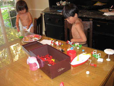 Well...just yesterday something sparked Travers' memory and he asked if he could play with the toys in the box that Marina's son had given him. He said he would play on the table so his sisters would not eat or loose the teeny-tiny pieces.
